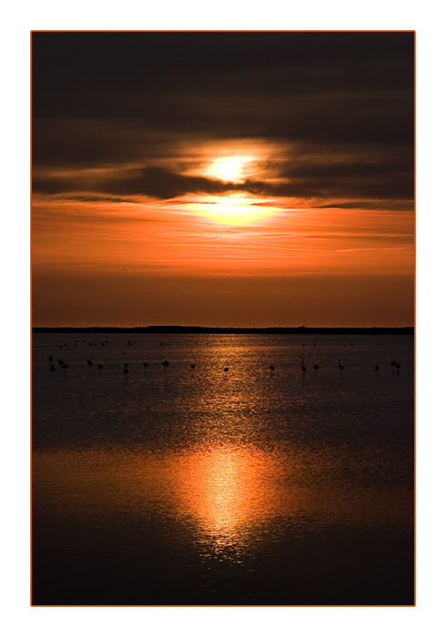 Flamingos bei Salin-de-Giraud im Sonnenuntergang