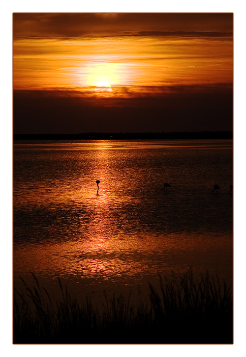 Flamingos bei Salin-de-Giraud im Sonnenuntergang