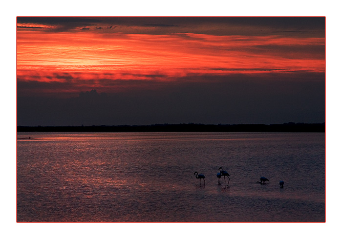 Flamingos bei Salin-de-Giraud im Sonnenuntergang
