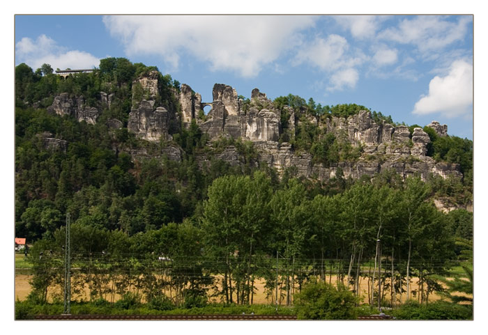 Blick bei schönem Wetter auf die Bastei mit Basteibrücke