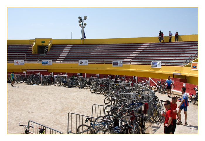 Stierkampfarena als Ziel bei einem Radrennen, Saintes Maries de la Mer (Camargue, Frankreich)