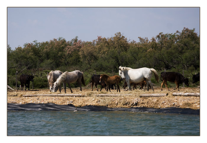 Camargue-Pferde und Camargue-Stiere an der kleinen Rhone
