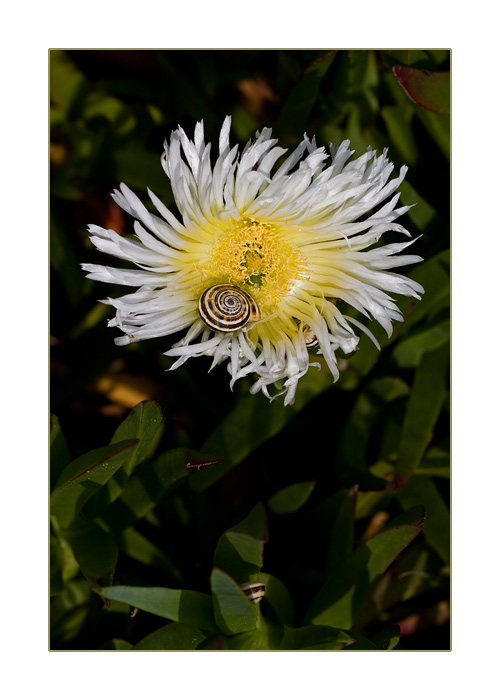 Delosperma (White Nugget - Mittagsblume) mit Schnecke, Südfrankreich