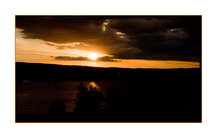 Sonnenuntergang und Schlechtwetter- Wolken am Staudamm (Lac) de Naussac, bei Langogne, Languedoc-Roussillon