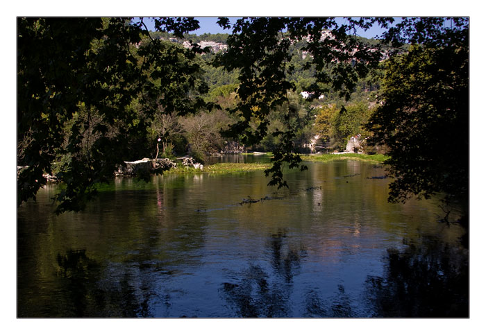 die Vaucluse, eingerahmt von Bäumen, Fontaine de Vaucluse, Provence-Alpes-Côte d’Azur