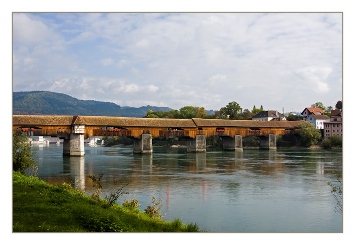 die Holzbrücke mit einer Länge von 203,7 Metern ist die längste überdachte Brücke Europas. Diese Brücke ist der Übergang in die Schweiz.