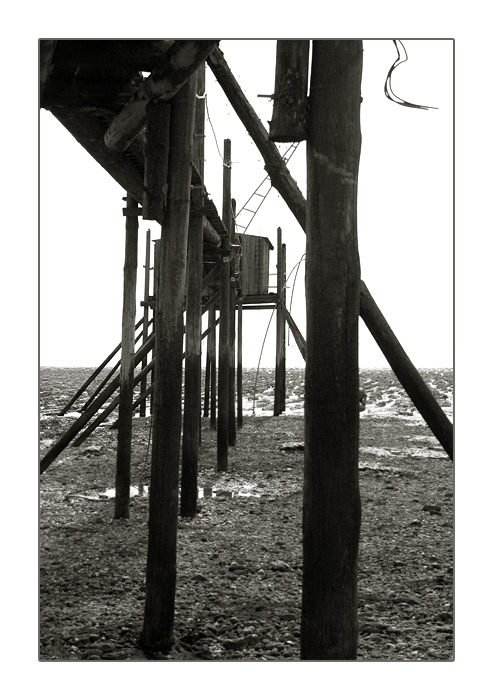 Fischerhütte, ein sogenanntes Carrelet, bei Tharon-Plage bei Ebbe im Gegenlicht