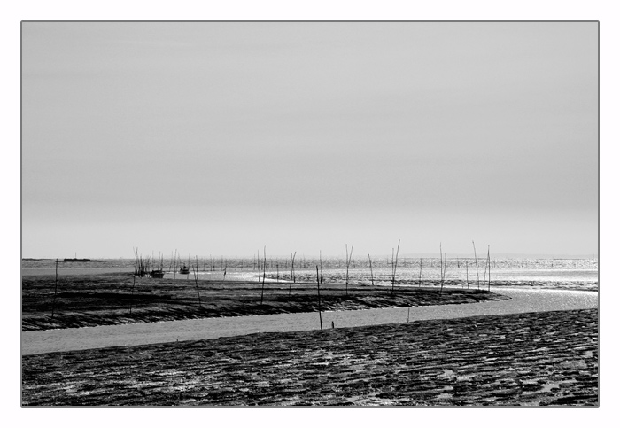 Fahrrinne bei Ebbe, Le Collet bei Bourgneuf-en-Retz. Drei Boote wollen noch in den Hafen