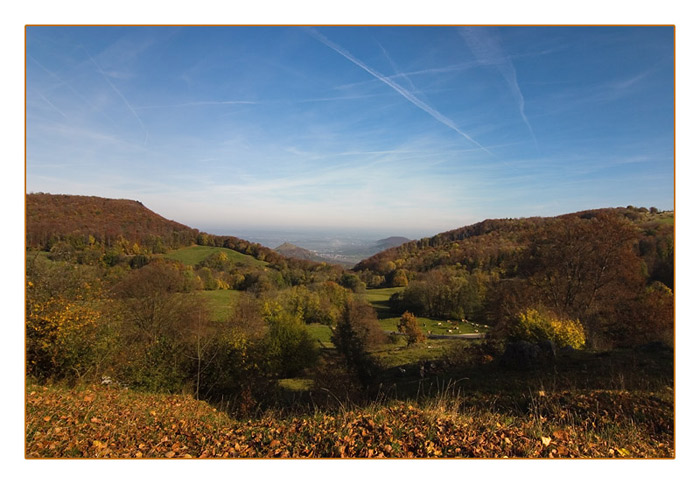 Blick vom Salzmannstein aus in den Vulkanschlot Randecker Maar. Im Hintergrund links die Limburg, rechts der Turmberg