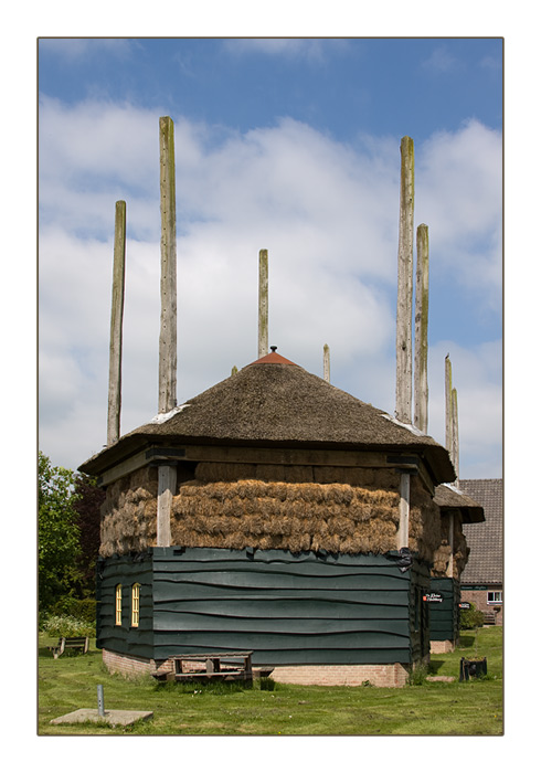Stroh und Heu wird in 6-eckigen Hütten verstaut. Das Dach lässt sich durch die hohen Stangen stufenlos erhöhen.