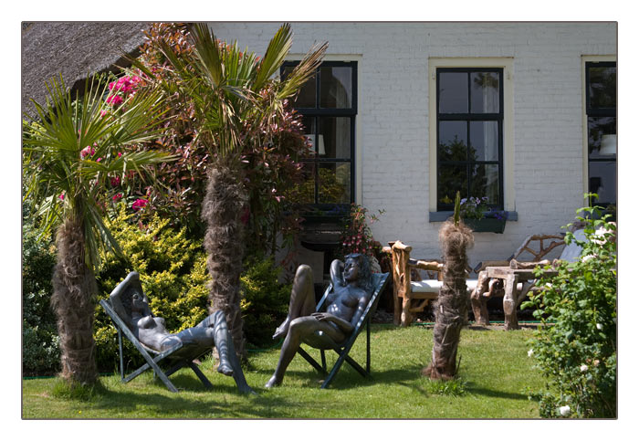 Anwesen mit Figuren im Garten am Kanal in Giethoorn