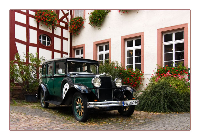 Oldtimer vor dem Brömserhof (Siegfrieds Mechanisches Musikkabinett) in Rüdesheim
