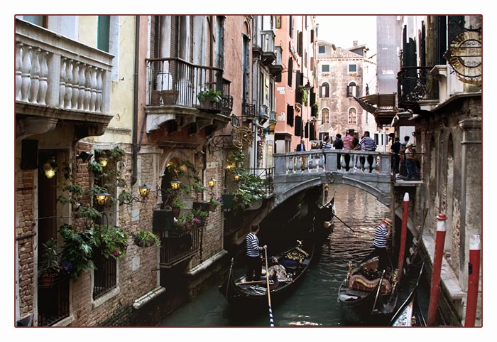 Gondolieren fahren die Gondeln durch die Kanäle von Venedig