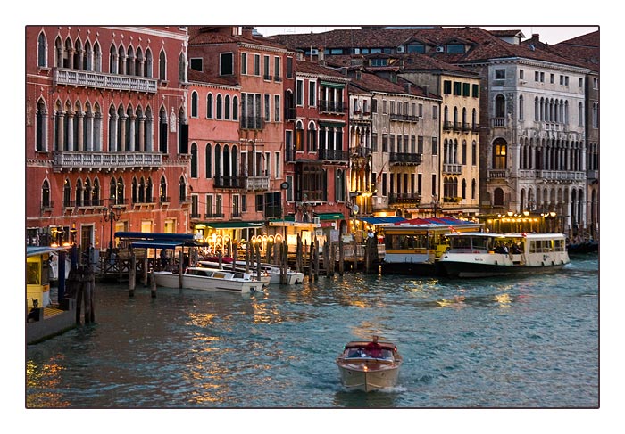 Blick von der Rialtobrücke auf den Canal Grande in der Abenddämmerung