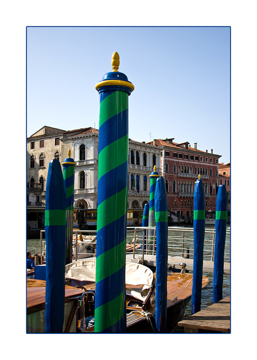 sehr schöne, bunte Pfähle stehen an den Schiffsanleger